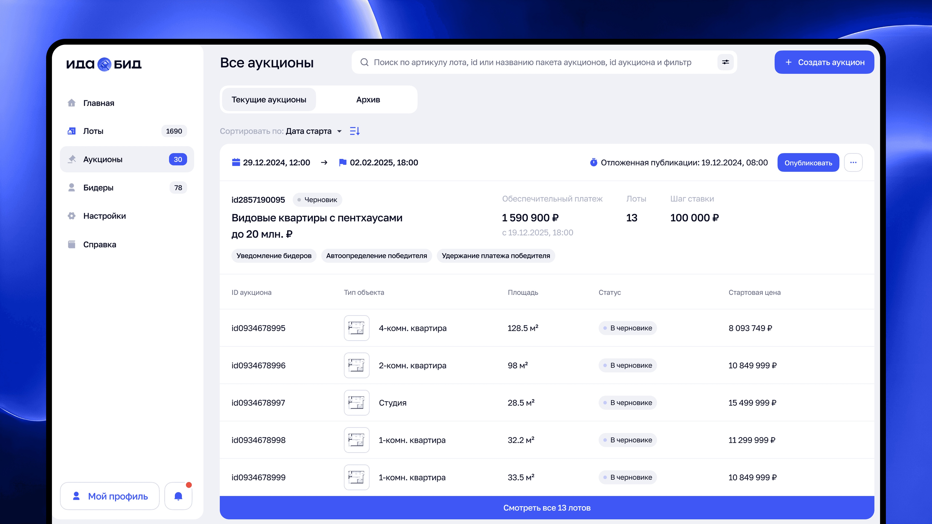 При поддержке менеджеров Ида.Бид были оформлены: 31 лот с подробными описаниями и настроена витрина в фирменных цветах застройщика. Аукционы размещены на собственном поддомене застройщика, а команда Ида.Бид подключила к платформе сервис отправки СМС, который использует застройщик, чтобы участники аукциона получали сообщения с именем отправителя ПСК. А на витрине и в email-рассылках использованы фирменные цвета бренда